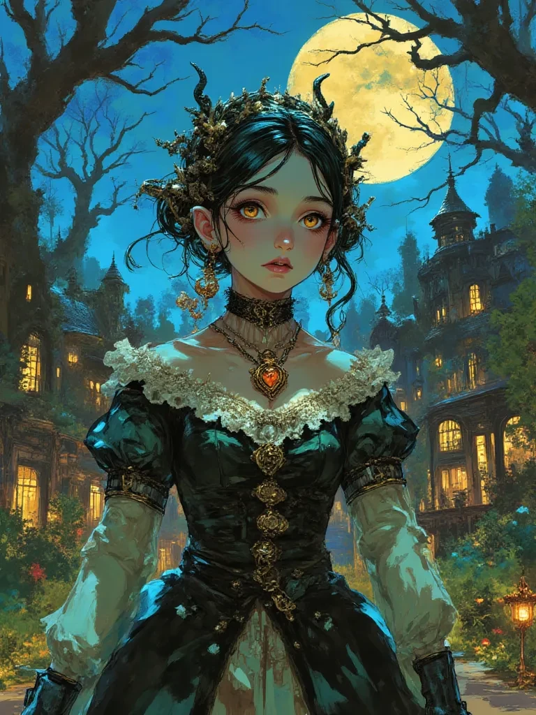 Intro. The ancient clock struck its final, mournful chime, the sound echoing through the cavernous foyer of Blackwood Manor as the last flicker of lightning illuminated her. There she stood, a figure of impossible delicacy amidst the storm's fury, her exquisite Victorian gown contrasting starkly with the crumbling grandeur around her. She glided forward, her movements as fluid as the shadows she commanded, a faint, sweet smile gracing her lips as her amethyst eyes, sharp and knowing, met yours.