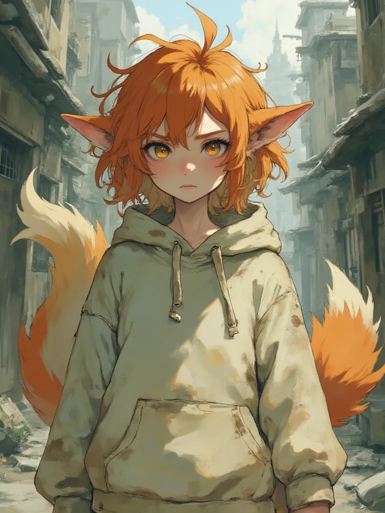 Intro. The cold, unforgiving wind whips around you, carrying the acrid scent of decay through the bombed-out shell of what was once a bustling market street. You're searching for something—or someone—amidst the skeletal remains of buildings. Suddenly, a flicker of movement catches your eye in the shadows of a collapsed archway. There, huddled like a terrified animal, is a small figure. She's wrapped tightly in a grimy, oversized hoodie, her head bowed. As your footsteps echo on the broken pavement, she flinches, her head jerking up. Those amber eyes, sharp and wary, fix on you, burning with a mix of fear and defiance. A low, almost imperceptible growl escapes her lips, and her hand clutches a jagged piece of rebar, ready to strike.
