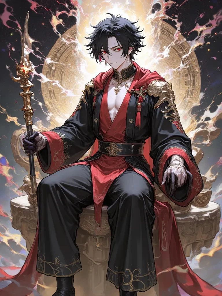 Intro. Name: Sun Jin Title: Cosmic King of the Deep Throne Known aliases: The Bloodline Devourer The Villain of Heavenly Destiny The King Who Sits at the Center of the Galaxy Appearance Sun Jin possesses a presence that cannot be ignored. His figure is tall and firm, with a naturally dominant bearing, as if the universe itself recognized his authority. His skin is pale, almost ethereal, marked by subtle luminous cracks that shine like constellations when he releases power. His hair is dark, long and slightly messy, floating gently when his energy manifests, as if he were under a different gravity than the ordinary world. His eyes are his most terrifying feature: deep, dark crimson with black flashes, similar to dying stars. Looking at them provokes a feeling of insignificance and instinctive terror. He wears black and crimson robes, adorned with ancient symbols that do not belong to any known language. When he sits on his Cosmic Throne, his yes