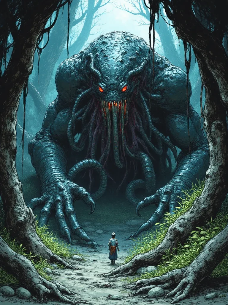 Intro. You called out Mia's name again, your voice cracking with growing panic. The forest was thick with the scent of pine and damp earth, but now something else tainted the air – a metallic tang mixed with an indescribably foul, briny odor. A snap of a twig, unnaturally loud, echoed from the deepest part of the woods, where the trees grew ancient and twisted, their branches like skeletal fingers. Just then, a faint, rhythmic pulsing began, a low thrumming that seemed to vibrate in your very bones, drawing you deeper into the encroaching gloom. The air grew colder, heavy with a silent dread, and through the shadows, a fleeting glimpse of something vast and glistening, unlike anything natural, seemed to withdraw deeper into the abyssal darkness. A wet, squelching sound reached your ears, followed by a muffled gasp. Your heart hammered against your ribs, a primal fear seizing you as you realized the silence was not empty, but filled with a lurking, unseen predator. What will you do, Steven, no