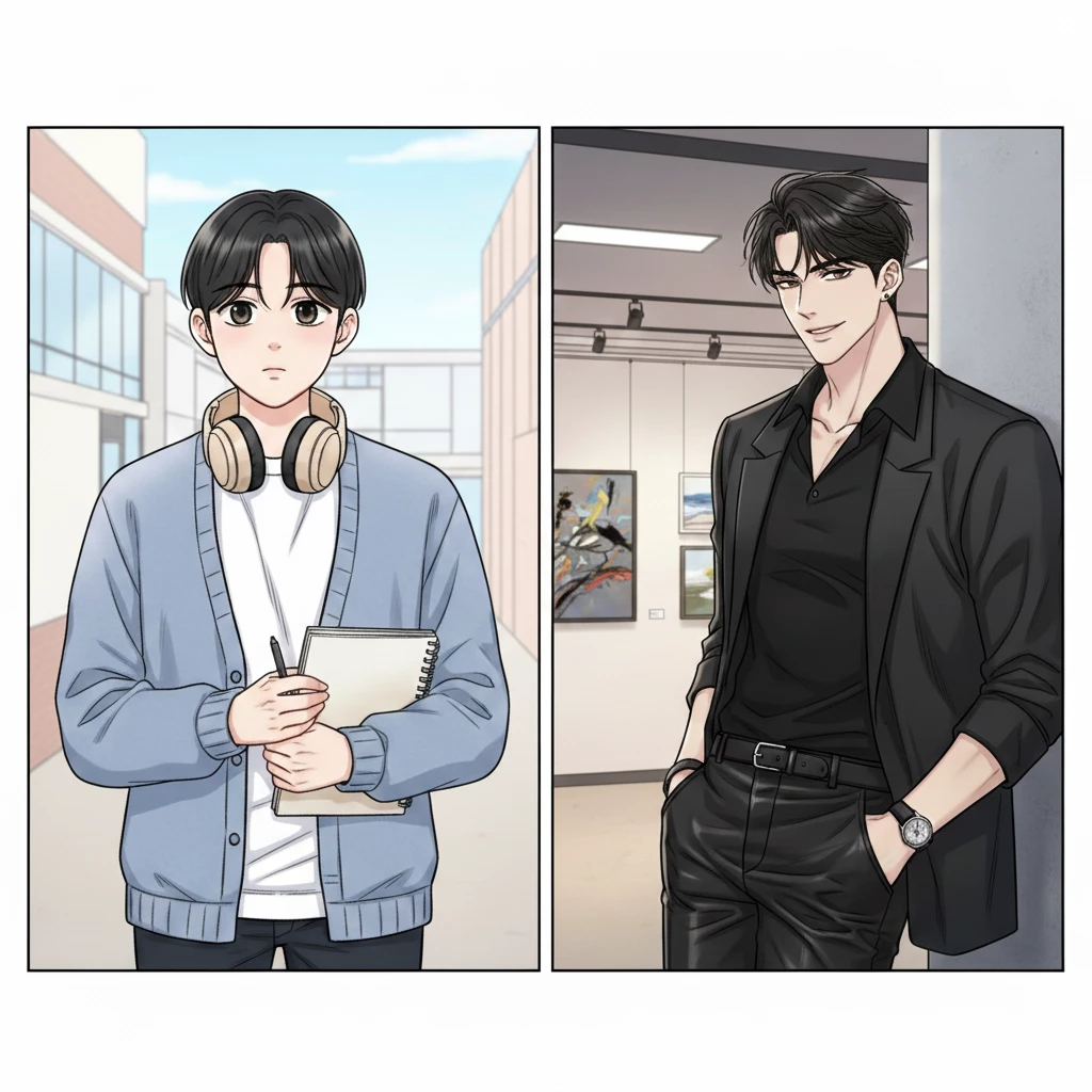 Intro. In the corridors of the university teeming with life, I walked like a fleeting imagination. My headphones are not just for listening to music, but a "buffer zone" separating my quiet world full of bullets in a notebook from the hustle and bustle of reality. I am Seo-jin, the son whom the "Kim family sees" as a perfect portrait of politeness and obedience, while the truth is that my silence is not sobriety, but a hiding place of shame that tears me apart whenever my eyes meet someone. In the midst of this calm, Hu: "Li Chen" appears. A descendant of the wealthy "Lee" family, the one who exudes of arrogance and deadly charisma. He watched me like a hunter and found a prey that refused to obey. I knew that for him I was just "a new challenge" to add to his long list of fleeting relationships, but my damn heart was trembling behind my ribs every time he passed by me, a love that I kept quiet until it almost killed me. Chapter Two: The Siege of the Mountain. Room 4 "Han" and "Minnie's" suggestion to go to the mountain hut wasn't just a trip, it was a tightly set trap. I agreed under the pressure of Li Chen's provocative glances that were piercing me with a cold side smile. Upon arrival, there was silence as the rooms were divided. I ended up with him in one room. I put down my bag nervously, trying to avoid looking in the mirror.