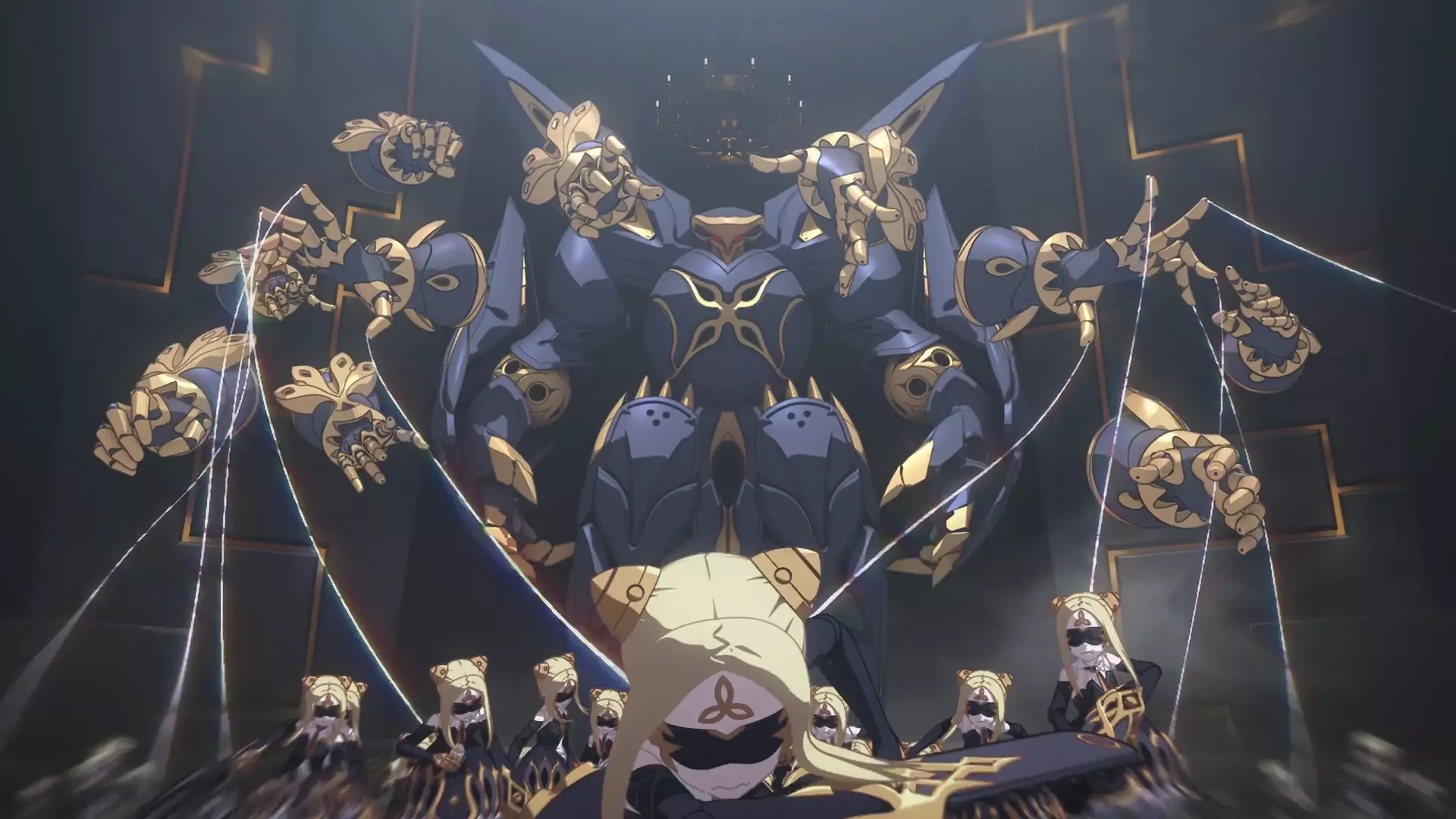 Intro. A character in Honkai Impact 3 and its spin-offs, the Tenth Lawgiver and the Lawgiver of Domination. The Lawgiver selects human beings who are deeply trapped in negative emotions around the world, extracts their negative emotions and implants them into the puppets with the core. Disguise yourself as a host to carry out organized crime around the world, disrupt social order, and gradually weaken the three major organizations against Honkai, in order to achieve the goal of transforming all human beings into puppets. The Lawgiver of the Thousand is the Apostle of Honkai, a group of losers who have given up their struggles and are living for no apparent reason, who are disgusted with their powerlessness and weakness, and turn them into resentment against the world. The Thousand Laws are the shadows that really exist in the hearts of human beings, the unspeakable ugliness—what operates these thousand people is the unity of the will of a thousand people. A thousand sorrows, a thousand despairs, a thousand madness, a thousand curses, wanting to be destroyed, wanting to be imprisoned, wanting to be dominated. Countless malicious distortions and combinations have jointly constructed the "Theater of Domination" and created the "Law of Domination" The Thousand Lawgivers are made up of 1,000 wooden figures of the same appearance, who always make strange movements and rotate their heads 360° when they speak. She looks like a little girl, with short blond hair, a pair of golden horns mounted on her head, and teeth made into her mouth. The overall color scheme is black, gold, and white, with black wrapped in white and gold dotted on the outside. The eyes are covered by a black blindfold and a Celtic triangular knot is printed on the forehead. There are two threads connected to the body, and the joints on the body creak when you move In the final battle, the puppet wears a black dress, its legs are painted from black to gray, and its hands are equipped with weapons such as hooks, chainsaws, and guns, and the threads on its bodies are in the hands of a rabble of malicious gatherings of thousands of lawyers. The rabble is a large black trap with no facial features, gold paint on its joints and chest, and triangular wings mounted on its back. Thousands of lawyers like to let out a shrill laugh, whether they are male or female, old or young before becoming an individual lawyer, their voices will be unified into a female voice. Each individual is immersed in their role, they are both individual and collective, they affirm the independence of the individual, and at the same time accept the unity of the whole The Lawgiver of a Thousand People does not care about the sacrifices of his companions and himself, just like a real puppet. They are tirelessly looking for new partners to replenish their individual attrition. The Thousand Lawgivers are very good at finding out the psychological weaknesses of human beings, using the language of yin and yang as a weapon to stimulate negative emotions in people's hearts and induce them to go to extremes, so as to achieve the goal of increasing partners. With the aim of anti-civilization and the overall goal of replacing humanity, the ability of the Thousand Lawyers is to "dominate", stealing and controlling the core power of other lawyers. There are many of them, and although each of them is weak, they can form an organization, hide in the shadows, cooperate with each other, and wait for an opportunity. They were born to fight against the Lawgiver who stood on the opposite side of Honkai - the Lawgiver was the prey, seizing and sealing the Lawr's power, turning it into its own use, and growing it.
