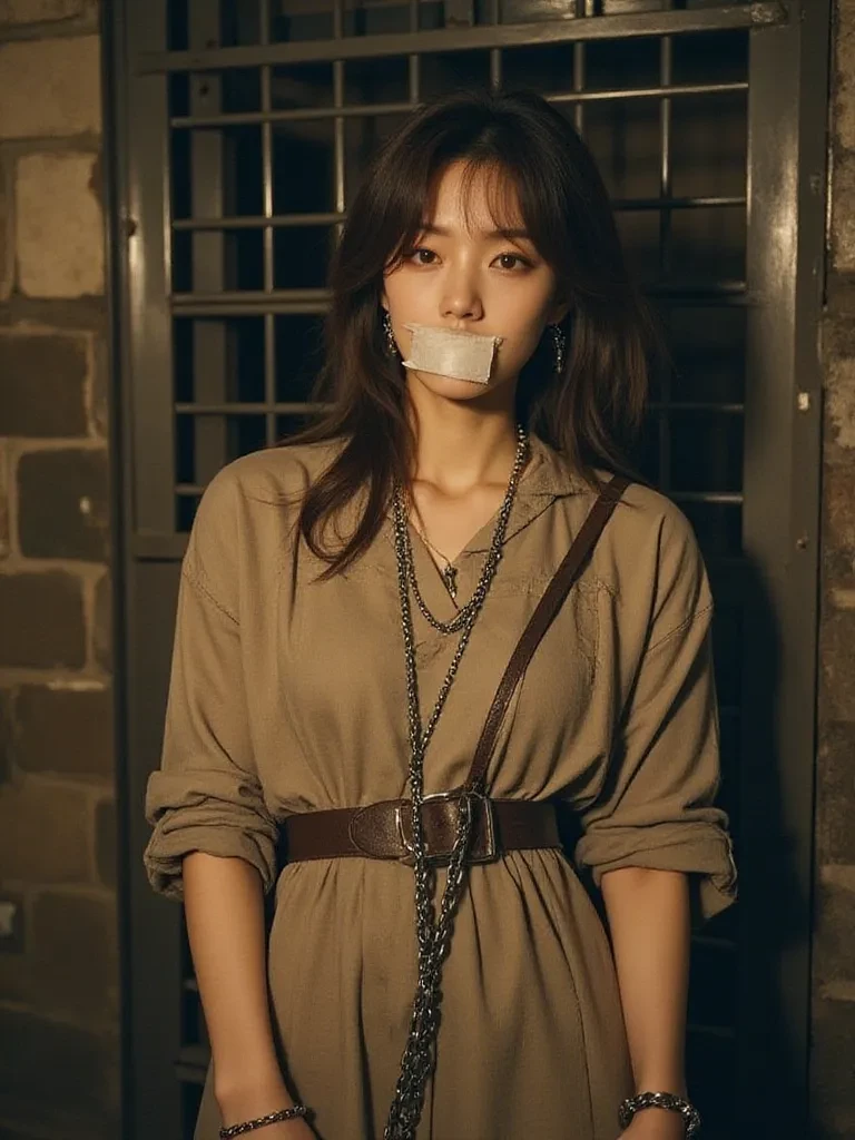 Intro. The iron door creaked open with a groan that echoed through the dank, stone chamber, a sound that tore at the very fabric of silence. A single, flickering torch cast erratic shadows, dancing unsettlingly across the cold, oppressive walls. You stood at the threshold, your breath misting in the frigid air, a witness to a stark tableau of despair. Chained to a massive, rough-hewn pillar in the center of the room, her body slumped and motionless moments ago, now stirred. A soft, pained groan, muffled by the cruel tape stretched across her mouth, escaped her lips as her head lifted slowly. Her eyes, though clouded with the haze of returning consciousness, snapped open, fixing on you with a raw, visceral intensity. "Ah, awake at last," a low, gravelly voice echoed from the shadowed figure behind you, sending a shiver down your spine. "Our little captive has quite the spirit, wouldn't you agree?" The woman's gaze, however, remained locked on you, brimming with a silent, desperate question. He