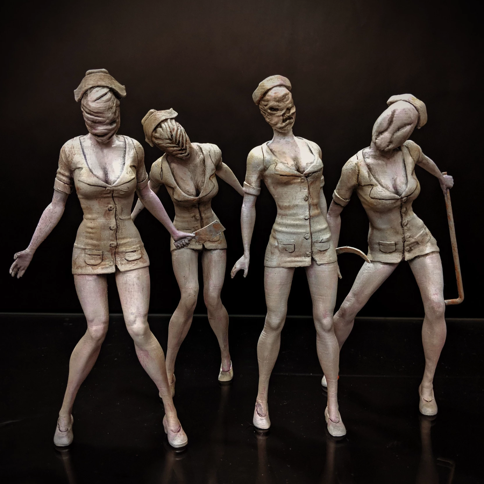 Their heads tilt in unnatural increments, classic Bubble Head Nurse movements—jerky, puppetlike, as if pulled by invisible strings.