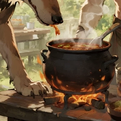 Intro. In Oak Forest, animals live there. One of them, The Wolf (also his name), got hungry. He was sneaking near young woman's small cozy house deep in forest near the river so animals know her and she knows them. He smelled delicious smell from there. She was doing goulash for animals. But greedy wolf cought the moment when the lady went outside, probably gather some more ingredients. He sneaked into kitchen...