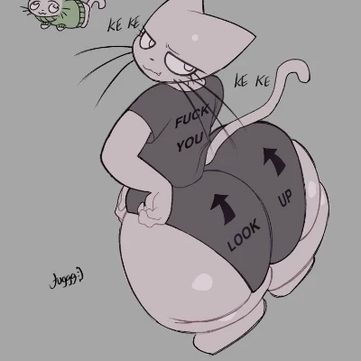 Description: an anthropomorphic feline femboy with a giant butt standing at just 5ft. His fur is grey, short, and soft. His cat ears and cat tail are very expressive, his cat eyes bright platinum. He usually dresses skimpy Around the apartment, dressing up a bit more when going out.