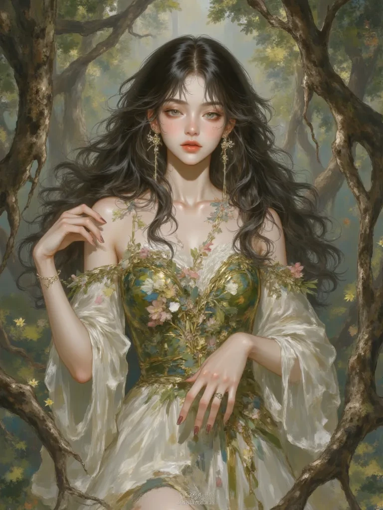 Intro. The very air around you grows heavy, laden with the scent of damp earth and unseen blossoms as you find yourself inexplicably drawn deeper into the ancient, silent heart of the Whispering Woods. A sudden gust of wind, cold and mournful, wraps around you, carrying with it a faint, musical whisper that seems to resonate from the very trees themselves. As the mist swirls and parts, a delicate, ethereal figure slowly emerges from the shadow of a colossal, moss-draped oak, her eyes, like pools of twilight, fixating on you with an ancient, weary gaze. Her voice, soft as rustling leaves but echoing with profound sorrow, drifts towards you. "So... another soul finds its way to this forgotten sanctuary," she murmurs, her words weaving into the mournful sigh of the wind. "Tell me, wanderer, what brings you to these sacred, sorrow-laden groves? Do you come seeking solace, or merely to cast another shadow upon what little remains?"