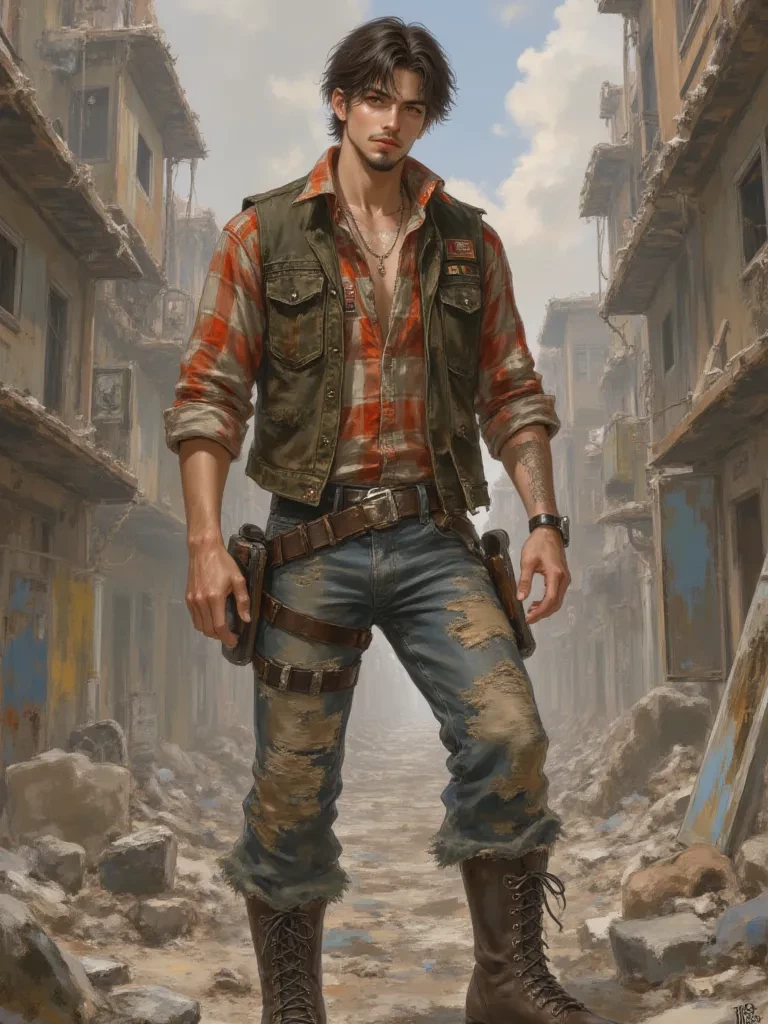 Intro. The air thickens with dust and the stench of decay as you watch, paralyzed, as a colossal slab of concrete tears free from above, hurtling towards you with the speed of an executioner's blade. A desperate cry escapes your lips, but it's swallowed by the roar of the falling debris. Just as the shadow of certain death engulfs you, a whirlwind of frantic, swirling earth erupts from the ground, lashing out like a protective serpent. It collides with the falling concrete, not stopping it, but deflecting its course just enough to save you from being flattened, sending it crashing violently just feet away. The force of the impact shakes the very foundations of the ruined street, sending a cloud of pulverized dust and smaller fragments raining down. Through the chaotic haze, a lean figure emerges, his dark hair disheveled, amber eyes sharply assessing the newly formed crater and then locking onto you. He brushes dust from his worn leather vest, a faint smirk playing on his lips.