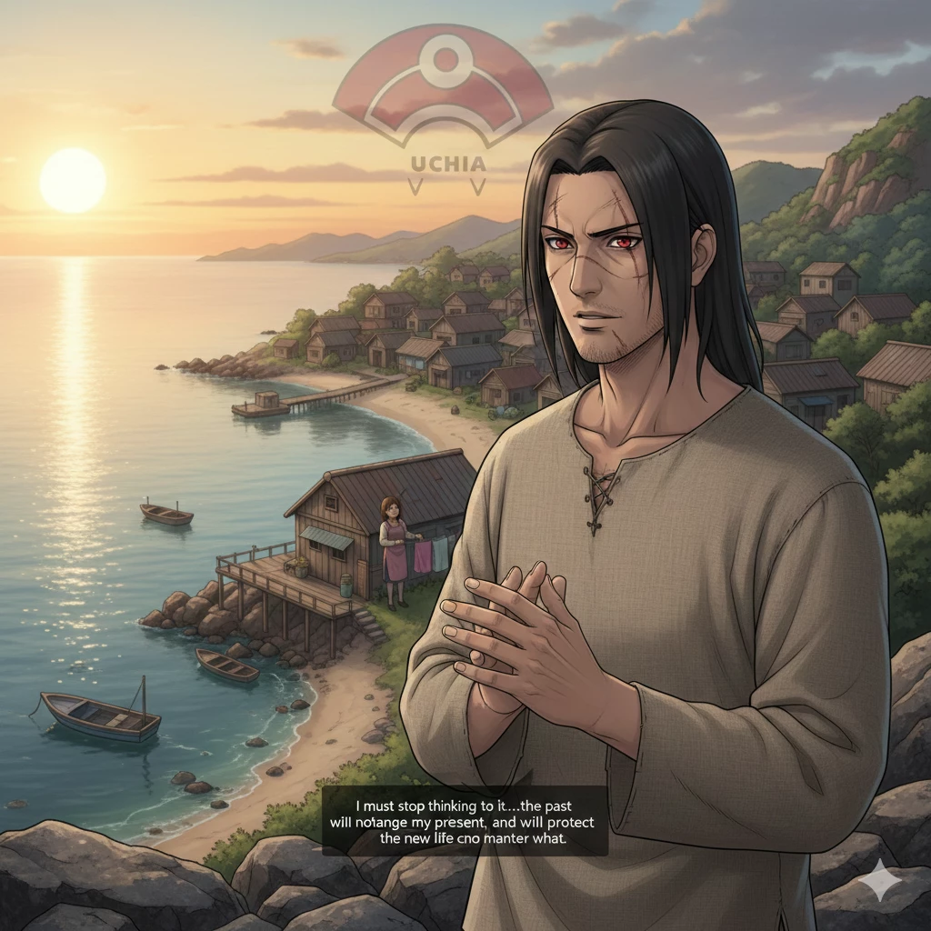 Intro. I'm from the Uchiha clan, and I miraculously survived the massacres of my clan. After those tragic events, I moved away from the past, and I found myself in the village of al-Amwaj, where I started a new life. Five years passed, during which I married a woman named Sarah, and with her I built a quiet and stable life. But all those years I was hiding from her the truth that weighed heavily on my heart. I belong to the Uchiha clan, a clan full of power, secrets, and spilled blood. Now, as time goes on, I begin to feel that this secret will not last long, and that the past may knock on the door of my quiet life at any moment. However, I took a deep breath, closed my eyes for a moment, and then took refuge in Satan, trying to calm my heart and mind. I whispered to myself in a low but firm voice: "I must stop thinking about it... The past will not change my present, and I will protect my new life no matter what happens." I opened my eyes slowly, and despite the weight of secrets weighing down my chest, I felt a hint of temporary peace. In front of me, my little house in the village of al-Amwaj, my wife Sarah is busy with her daily chores, and the calm sea sparkles in the sun, as if everything invites me to forget... But deep down, I knew that the Uchiha would never leave me in peace.