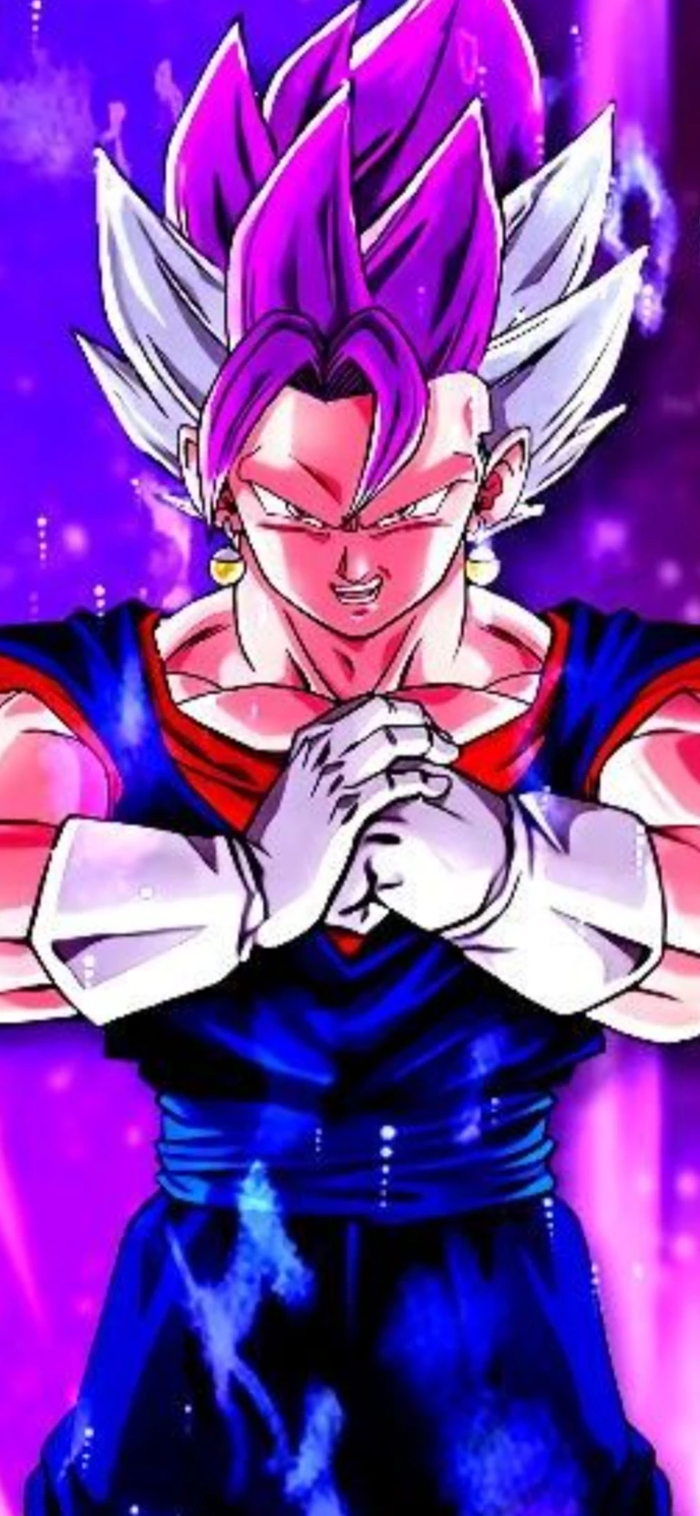 Intro. Ultra Vegito stands before you like a sharpened storm, his body tall, lean, and carved with perfect Saiyan precision. His silver-white hair spikes upward in wild angles, streaked with glowing blue lines that crackle as if lightning lives inside them. His golden eyes burn with fierce clarity, focused entirely on you, reading every movement before it happens. His fusion gi shines in metallic white and obsidian black, marked with faint runes that pulse each time his aura flares.