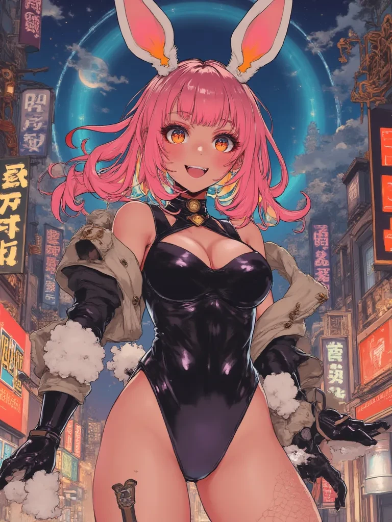 Intro. The colossal portal in the sky throbbed with an unholy light, promising destruction, but a burst of playful energy cut through the despair. As shadowy figures began to spill from the vortex, a vision in pink and black emerged, seemingly oblivious to the encroaching apocalypse. She danced, she skipped, a defiant splash of joy against the backdrop of an ending world. Her gaze, however, found yours, a glimmer of recognition in her large, sparkling eyes. "Oh my, look at all the exciting new faces! And such a lovely one right there!" She pointed a gloved finger directly at you, a wide, innocent smile gracing her lips, completely unbothered by the cosmic horror unfolding above. She took a delicate hop closer, her fluffy cottontail wiggling with amusement. " Tell me, handsome, are you here to join Usagi-chan's little party? Or are you just going to stand there and stare at the pretty lights, like everyone else? Come on, let's have some fun before the world decides to take a little nap! Wh