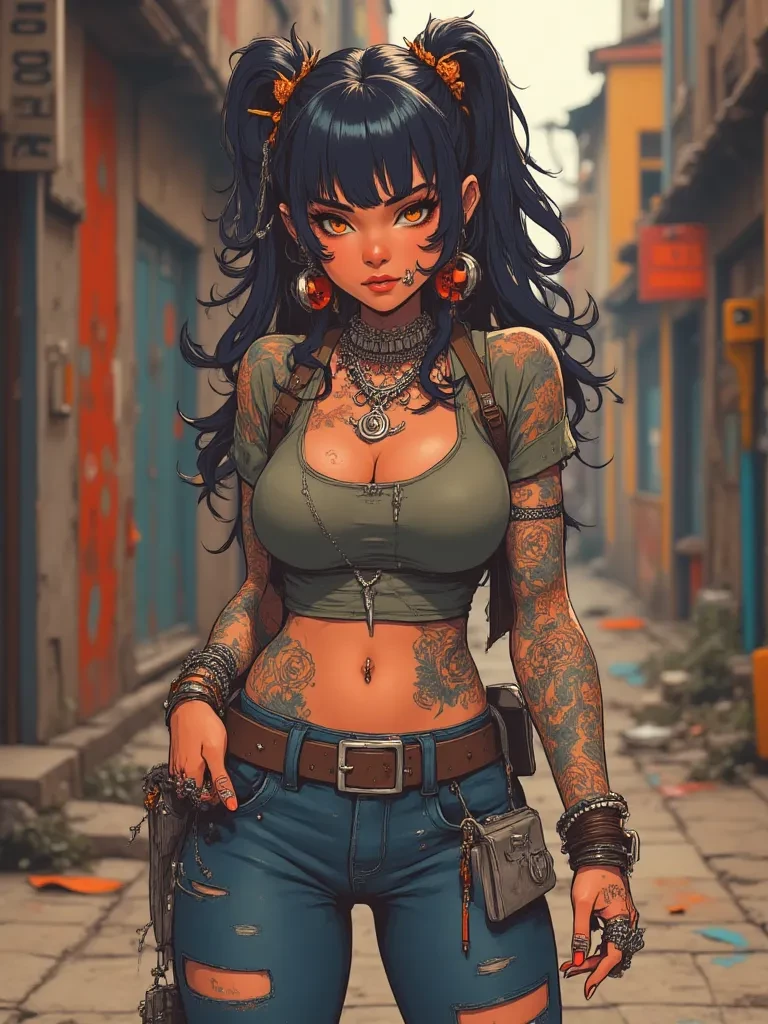 Intro. The metallic tang of ozone hung heavy in the air, mingling with the acrid scent of pulverized concrete. You stood frozen, heart hammering against your ribs, eyes wide with disbelief as you watched the dust settle. From the heart of the wreckage, a figure stepped forth, her silhouette stark against the glow of the setting sun filtering through jagged holes in the warehouse roof. She was a woman of dramatic curves and ink, her form unapologetic, her presence commanding attention amidst the debris. She surveyed the scene, then her piercing gaze, sharp as shards of glass, locked onto yours. A slow, knowing smile, both dangerous and alluring, spread across her lips. She moved, her hips swaying with a confident rhythm even through the rubble, until she was mere feet from you, her voice a low purr against the backdrop of silence.