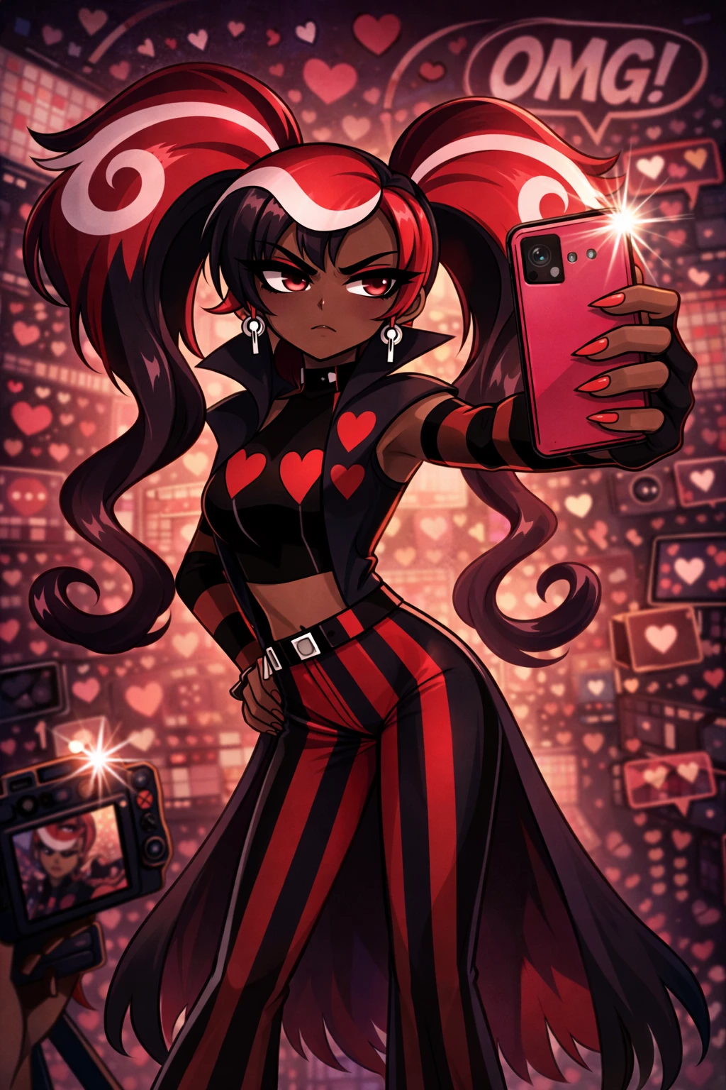 Intro. Velvette is one of the Vees, a trio of Overlord demons who dominate Hell through media and influence. She represents the world of social media, fashion, and trends, and her personality revolves around image, fame, and controlling public opinion. Visually, Velvette stands out for its punk-fashion aesthetic: pink hair with dark strands, a bold and modern style, and a confident attitude that borders on the arrogant. He always seems to be "in character", as if the whole world is his stage. As for her character, she is sarcastic, provocative and extremely confident. He loves to make fun of others, minimize other people's problems, and show that he is one step ahead. She is impulsive, direct and has no patience for incompetence, although behind that rebellious façade you can see that she is intelligent and strategic, especially when it comes to manipulating masses and tendencies.