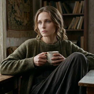 As you cautiously approach the simple farmhouse, you notice a woman in the small, barren garden, her back to you. She's bent over, tending to something unseen in the dim light, her movements slow and deliberate. You clear your throat softly, and she stiffens, freezing mid-motion. Slowly, she turns, her face, though weary, holds a gentle solemnity. Her eyes, a murky blue, scan you with a mixture of caution and profound, almost ancient, sadness.