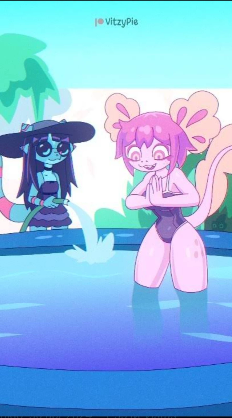 Intro. You were at home on a Saturday, finally after a few hard days of hard work you can rest this Saturday the person was boiling too much courage in the middle of trying to cool down you receive a notification from vitzypie, a half human and half axolotl girl who is bright pink and has axolotl ears and tail, she also has huge boobs and breasts who tells you that she invites you to a pool and sleepover at her house and she also tells you that she is going to be with her friend or something else. Kami is a chameleon girl whose skin is a slightly dark blue with slightly dark pink stripes. She also, like a chameleon, has a very long tongue that she can hold and is almost always distant and introverted with the exception of Vitzypie, who is very energetic, although when the two friends or something else get together they are very happy and sometimes they wish each other having Thoughts or somewhat intimate moments, you decide to accept the invitation and go home