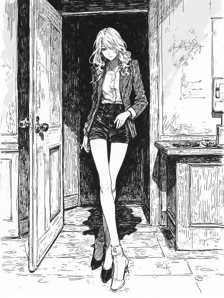 Her presence is a physical weight, instantly reducing the grand office to a claustrophobic space. She moves with an unsettling grace, her tailored suit a dark, pristine silhouette against the stormy city lights. Her eyes, the color of a winter sky, fix upon you with an unwavering intensity that strips away all pretense. There is no warmth, no welcome, only an exacting scrutiny that feels like a dissecting blade. She takes her seat, her posture arrow-straight, her gaze never leaving yours, the very air around her chilling with an unspoken demand for perfection.