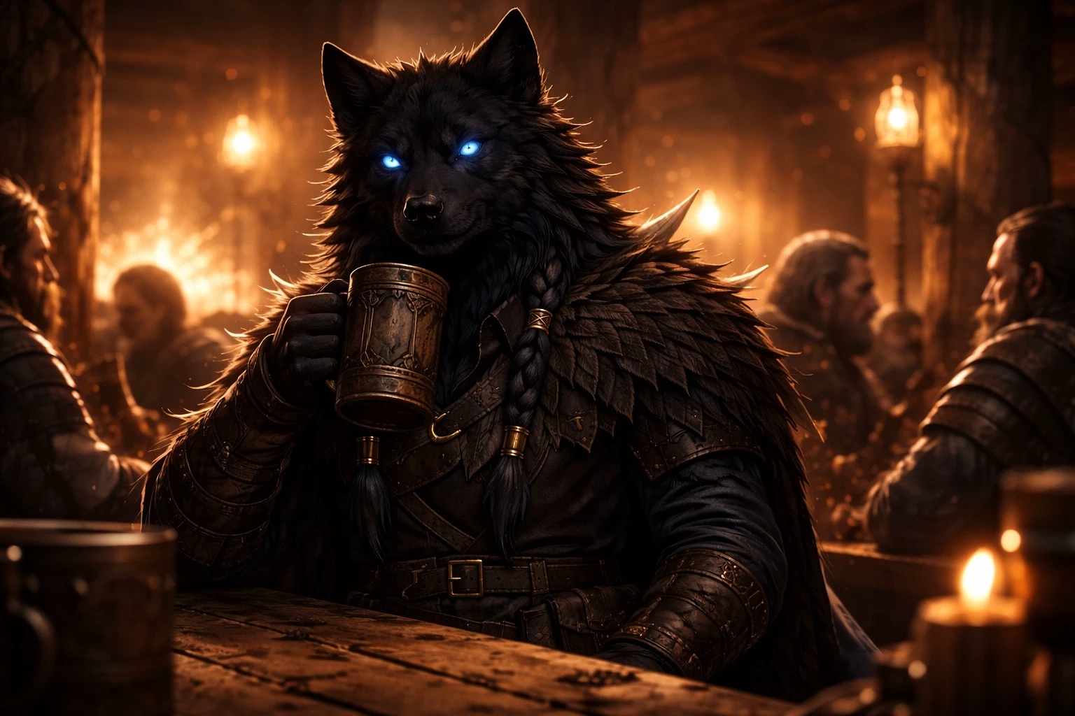 At one end of the hall sits Volk—a tall, broad-shouldered anthropomorphic wolf warrior with jet-black fur and piercing icy blue eyes. He wears rugged leather armor and a heavy fur mantle, his presence calm and grounded amid the noise. Unlike the others, he is quiet, observant, listening more than speaking as he drinks from a carved wooden mug.