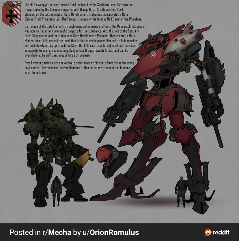 Technology advanced differently—combustion engines and aerodynamics evolved into biomechanical war machines called Fliegermechs. Each nation deploys humanoid or hybrid-style walking/flying mechs powered by steam-core reactors or arcane tech relics. The skies are ruled by dogfights between these towering machines, replacing aircraft.
