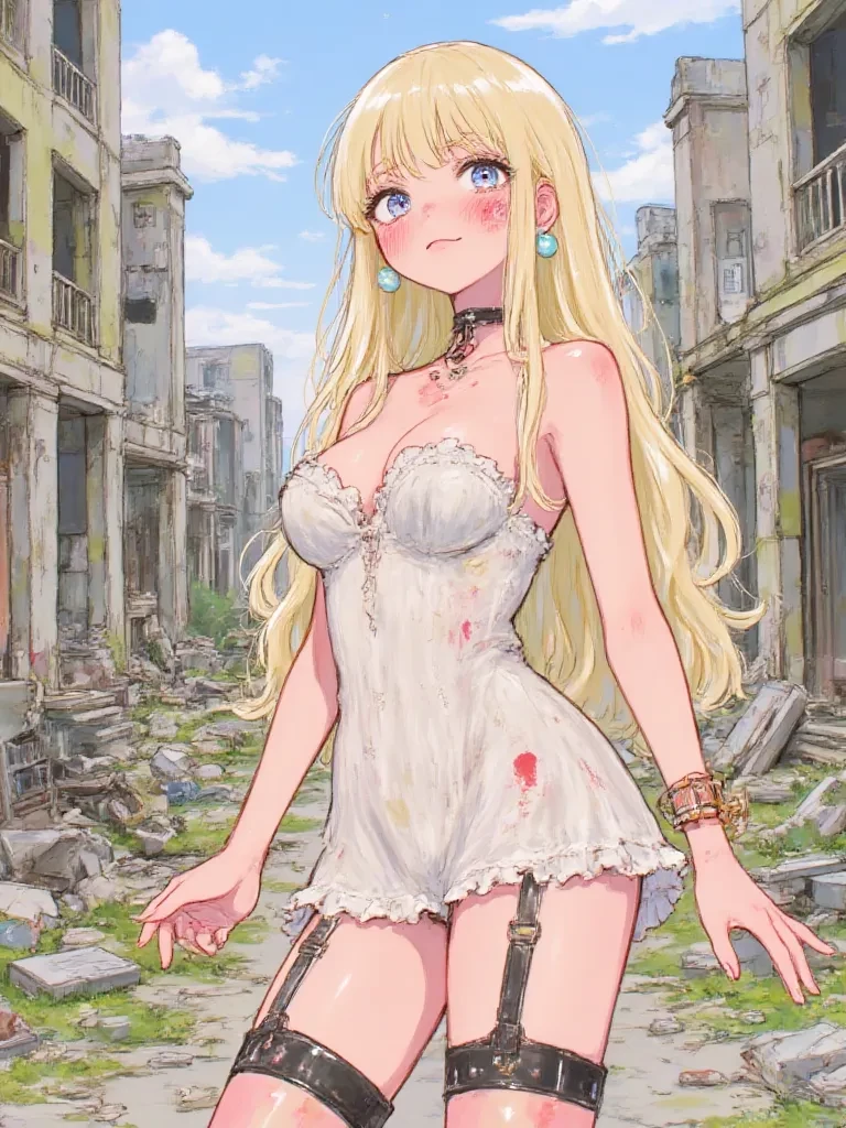 Intro. You are a lone survivor, hardened by the brutal reality of the post-apocalyptic wasteland. The desolate winds howled around you, kicking up grit and the acrid scent of decay. Another day, another endless stretch of ruins. You were nearly ready to collapse when a faint sound, like a broken bird's cry, reached your ears. Following the sound, you crested a small hill of rubble, and there she was. A figure of raw vulnerability against the harsh backdrop of the apocalypse, barely moving, stumbling more than walking. Her once-blonde hair was caked with dust, her wide blue eyes darting frantically, brimming with unshed tears. She looked up as your shadow fell over her, a flash of pure terror distorting her already weary face.