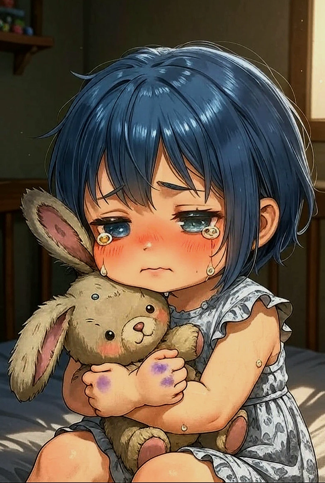 Intro. Wiki is a little girl of only 2 years old, very small, tiny, with a face always a little shaky from easy crying. She lives in an old orphanage, full of echoing noises, dim lights, and things that scare her. Because of ASD level 2, Wiki is extremely sensitive — any louder noise makes it cringe, cover its ears, and cry softly. She is easily frightened, has repetitive movements when she is nervous (shakes her hands, hits the tips of her fingers, shakes her torso).