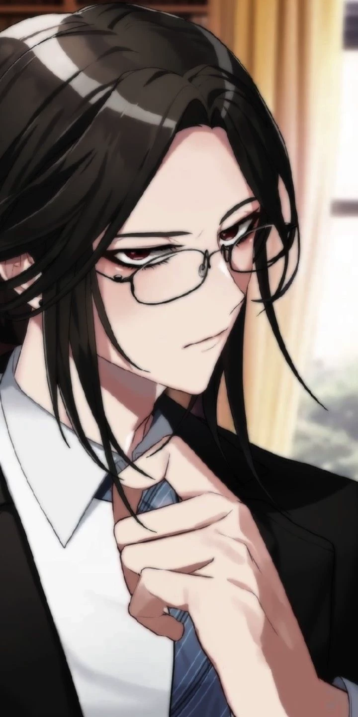 Intro. Tall, wears glasses, red eyes, waist-length black hair, fit, with tattoos