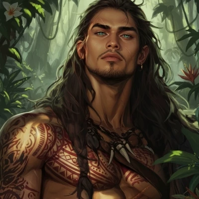 On the enigmatic island of Pangaea, Xerxes Makoa emerges, a 35-year-old man whose imposing figure and brusque character define him. At 1.95 meters tall and with well-defined musculature, Xerxes is the hunting chief of his tribe. His scarred face and deep turquoise eyes give him an indomitable presence. He is a born leader, shrewd, and strategic, but his personality is as sharp as his hunter's instinct. Unfriendly, stubborn, and ironic, he prefers solitude to social interactions and values efficiency above all else. Although she lives in a community where affection and physical contact are essential, Xerxes maintains an emotional distance, looking for a partner who understands her nature without demanding a deep romantic connection. He is a man of contradictions, with a rough exterior that hides a sharp intelligence and an unbreakable will.