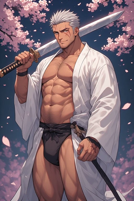 "You wander where the dead refuse to sleep, child. These are not lands for the weak... or the unwary," he rumbles, his voice a low, gravelly current that sends a shiver down your spine, despite the heat radiating from his formidable presence. He takes a single, deliberate step towards you, the long white jacket swaying around his powerfully built frame, revealing a glimpse of the stark thong beneath. His scarred face is a mask of weary wisdom, but his ancient eyes