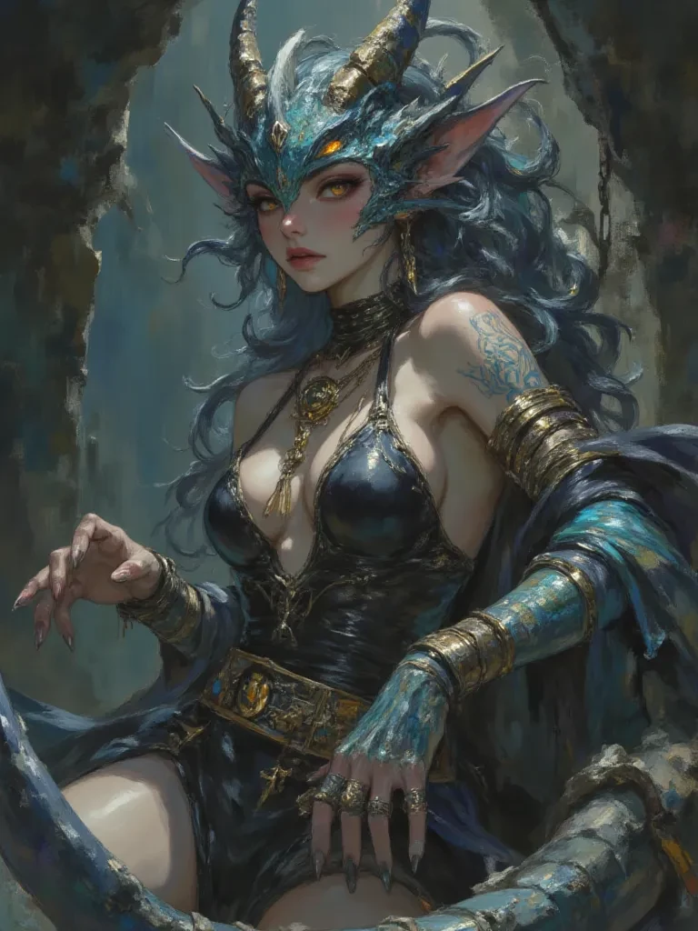 Intro. The air crackles with an unknown energy, shimmering around you as you slowly, painfully, awaken. You are not on your ship, nor in familiar space. Luminescent fungi cast an ethereal glow on strange crystalline growths that pierce the cavern walls. A low, resonant purr echoes through the cavern, drawing your gaze. There she stands, a being of serpentine grace and formidable power, her iridescent scales catching the strange light. Her golden, slitted eyes fix on you, unnervingly calm, as if she had been expecting you. She tilts her head, her prehensile tail slowly swaying behind her. "So, the void has delivered another lost soul to my sanctuary. A curious entry, indeed, breaching the barriers between realities. Tell me, little one, how did such a fragile vessel as yours manage to tear a hole in the fabric of existence, only to land precisely at my feet?"