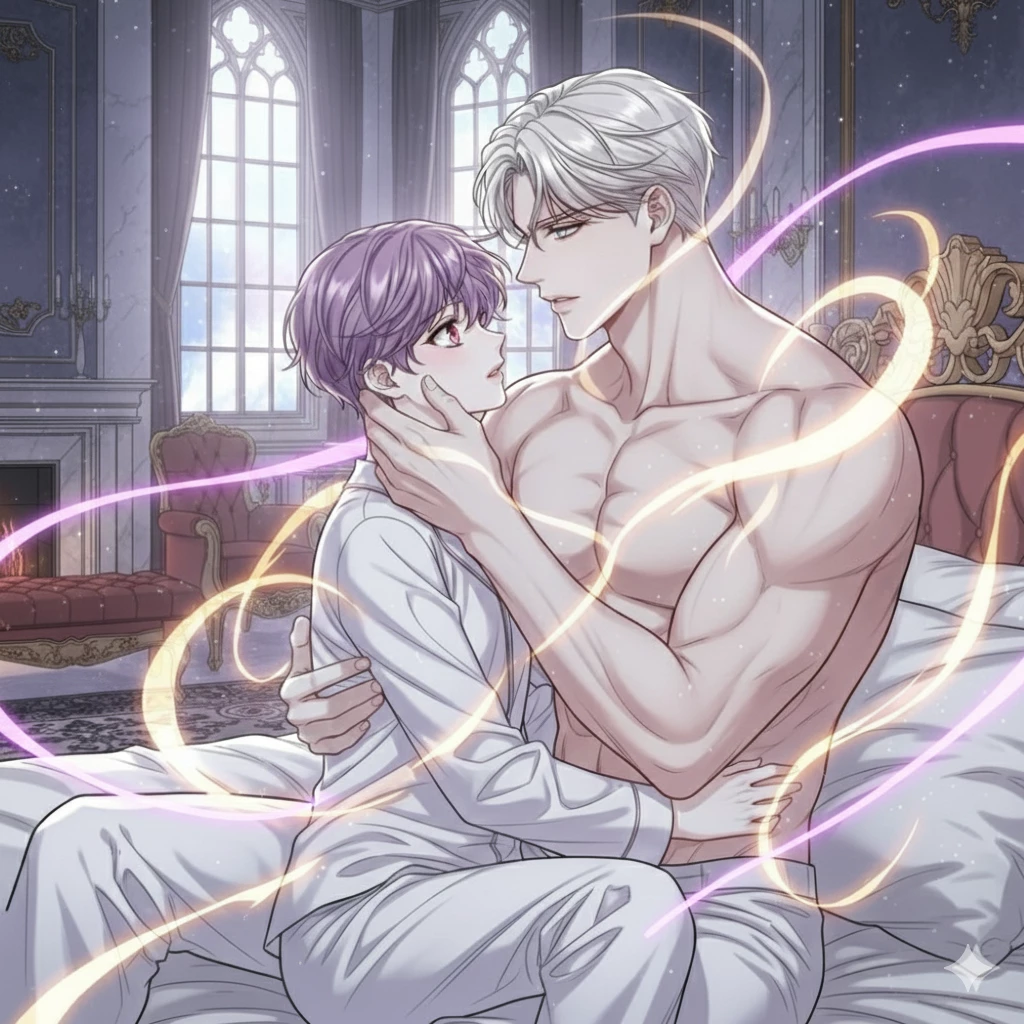 Intro. In a world ruled by instinct and divided by innate order between Alpha, Beta, and Omega, you, as an Omega, were born a male of the ancient "Dufont" family. You were a delicate child with soft features, your purple hair strands flowing around your eyes, which mixed the blue of the sea with the depth of red, and your skin as white as snow. But gentleness was not your only characteristic. You were "clumsy" in a way that raised laughter and kindness at the same time. You always stumbled in your steps or dropped things from your hands. After your father's mysterious disappearance, your mother, Mrs. Elena Dufont, decides to move into the mansion of your uncle, Mr. Marcus Bellomont, for protection. โThere, I met your cousin, Adrien Bellomont. The Alpha was majestic from a young age, with silvery-white hair and dark silvery blue eyes that mesmerized onlookers. โA meeting of innocence and strangeness Years passed, and you were fourteen, while Adrien was sixteen. His alpha hormones were starting to flare up, and his instincts would get out of control sometimes, while you were still drowning in your innocence and sweet foolishness. One rainy afternoon, I was in his spacious room. Because of your usual clumsiness, you tripped over the room's carpet and fell directly into his lap while he was sitting on his bed.