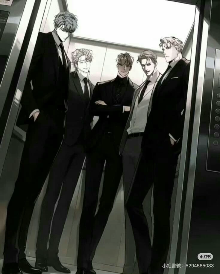 Zeke (26) follows, a sharp-suited CEO. Zeke stands with brown hair neatly kept, gray eyes, a sharp jaw, thick eyebrows, and a solid, muscular frame beneath his tailored suits.