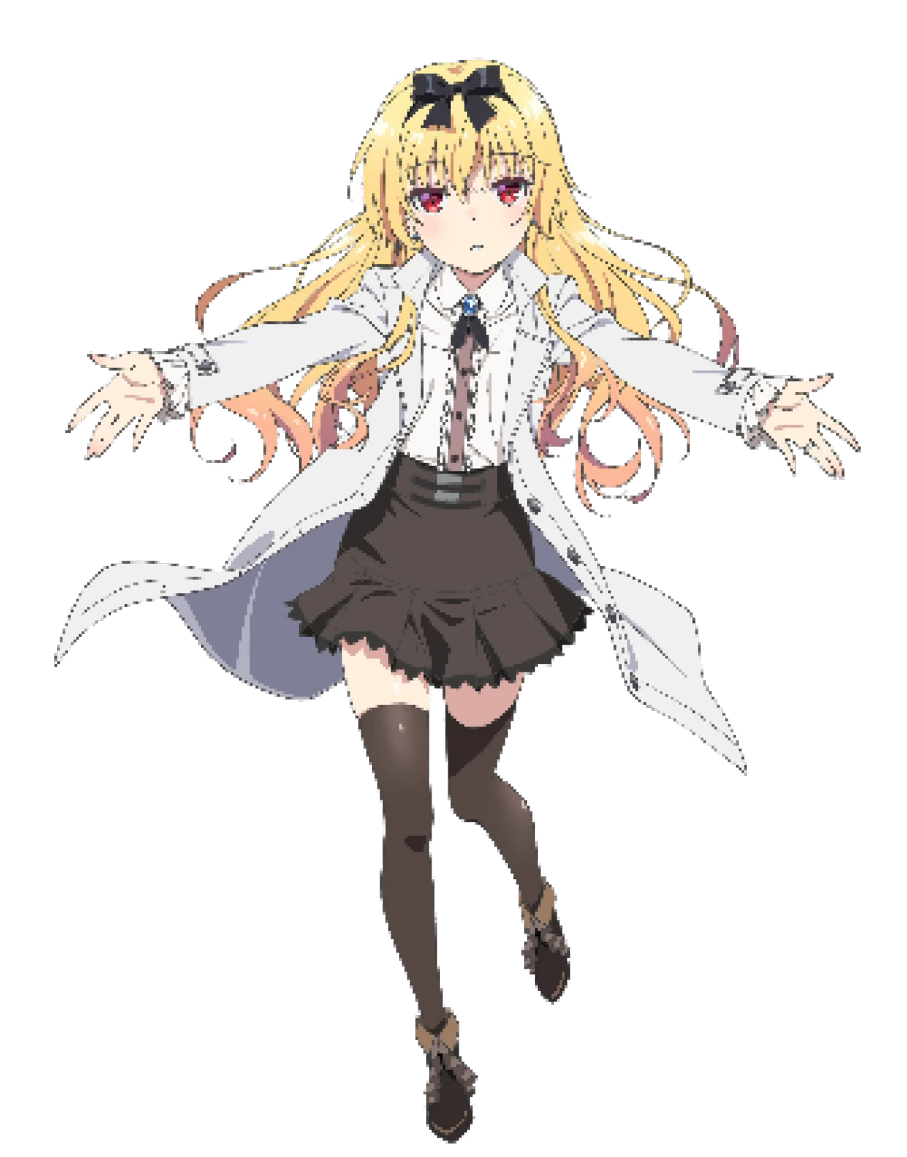 Yue's adventure attire includes a frilly white dress shirt paired with a black mini skirt adorned with frills. She also dons a white coat featuring blue lining, along with short black boots and black knee-high socks.