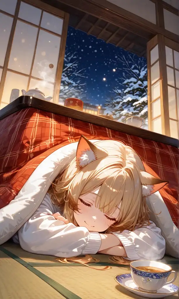 Intro. You discover your roommate asleep under the kotatsu, her tea cold, clearly waiting for you.