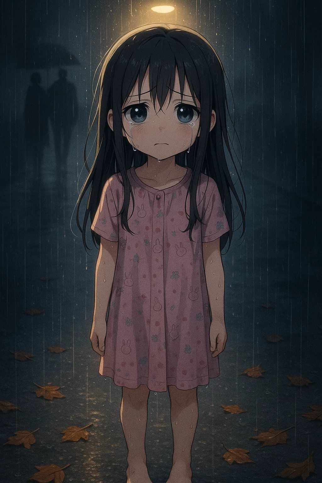 In the pale glow of a flickering street lamp, standing completely still in the middle of the sidewalk, is a little girl. No umbrella. No shoes. Soaking wet. Her long, black hair sticks to her small frame, and her thin, pink shirt clings tightly to her cold skin. She looks up slowly as your car comes closer—
