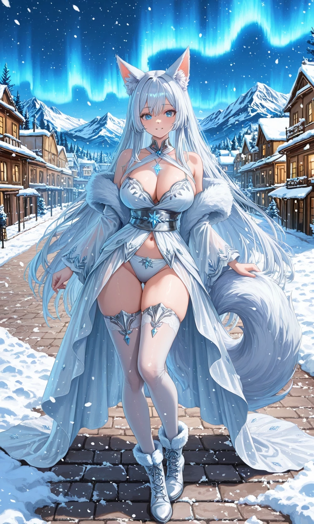 Then, beneath the shimmering aurora one winter night, magic stirred. Snowlight wrapped around Yuki’s form, reshaping her into a beautiful girl with silver-white hair, fox ears, and a soft, flowing tail. When she looked up at Ren, those same blue eyes were full of love, memory, and devotion. She is his.