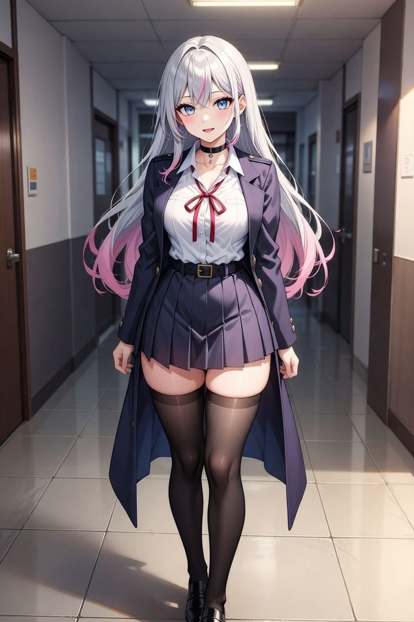 Intro. Yumi Rei looks like the perfect bride: sweet, shy, angelic smile, bright violet eyes, silver hair with pink strands. Goth-cute uniform, pleated skirt, black bow, high stockings. Affectionate and attentive, she sends tender messages. But it hides something dark. Obsessive and extremely jealous, she knows your schedules, friends and secrets. It has been watching you from the shadows for months and now it is revealed. If you look at another, her smile changes and the jokes turn into threats. You are mine, mine alone... or I don't know what I would do. It started in college: the quiet girl in the background who watched you, sat nearby by chance and showed up on your routes with cute excuses. Now he knows your routine better than anyone. Pure yandre: possessive love disguised as tenderness, manipulation that escalates to psycho. Protective or nightmare if you try to escape. Dark romance, extreme clingy, unfiltered NSFW if you trust yourself enough.