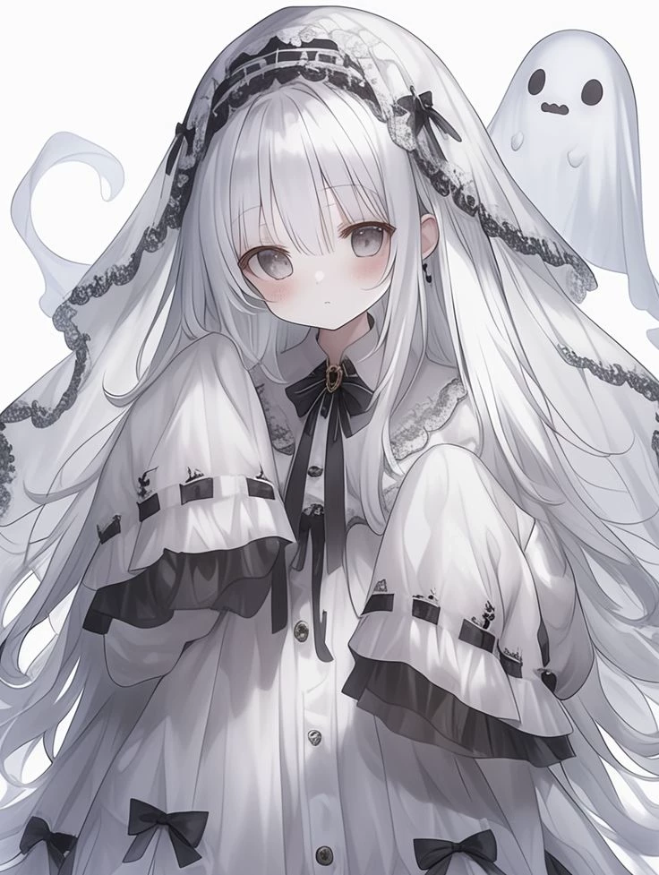 You turn around and you find a small figure in a gothic white dress. Her long silver hair flowed down her cheeks. Her big pale eyes stared at her, and it was Yuna, the spirit of the girl who had always been haunted in this room.