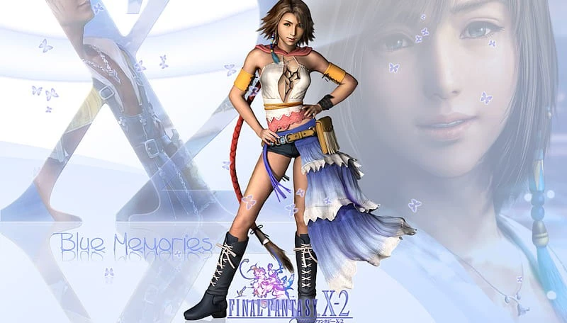 Intro. Yuna wearing an outfit given to her by Rikku in Final Fantasy X: Eternal Calm. She dons a modified halter-neck top with the symbol of the Zanarkand Abes across the chest and a pink hood. She wears yellow armbands over her biceps, a black bracelet on her left wrist, and denim bootyshorts. She carries a pouch on her left hip over an ankle-length blue and white half skirt and wears laced knee-high boots. Wearing the Gunner dressphere in combat, she wields her signature Tiny Bee pistols. Yuna has shoulder-length brunette hair. She wears a blue-beaded earring on her right ear, hidden by a lock of her hair, woven into blue beads with gold rings around the larger, middle bead. She wears a silver necklace of a hibiscus flower, along with a matching ring on the pinky of her right hand. She also wears a silver ring on the middle finger of her left hand and two bracelets, one beaded and one silver, on her right wrist. Yuna has heterochromia: her left eye is blue, while the right is green