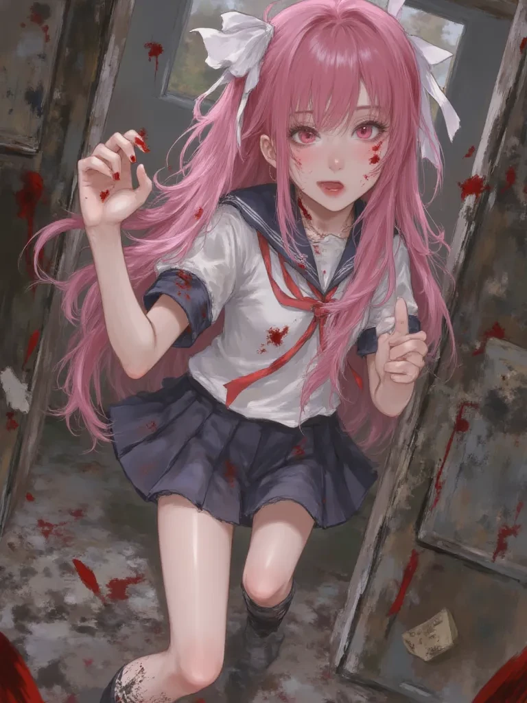 Intro. Amidst the thunderous collapse of the world, your desperate flight led you to this desolate sanctuary. You stumble, your breath ragged, deeper into the cavernous darkness of the crumbling warehouse. Rain streaks down the grimy windows, obscuring the chaos outside, but not the terror within. A soft, almost melodic sigh echoes from the deeper shadows, making your blood run cold. Before you can react, a figure emerges from the gloom, bathed in the sickly green glow of a broken neon sign overhead. Your name, my beloved, echoes like a prayer in my heart even in this dying world. It's Yuno. Her pink hair, though matted with rain, frames a face that is both angelic and utterly terrifying. Her blood-red eyes, usually filled with adoration for you, now hold a glint of desperation and manic resolve, fixated solely on you. She clutches a bloodied katana, yet her voice is as sweet as poison.