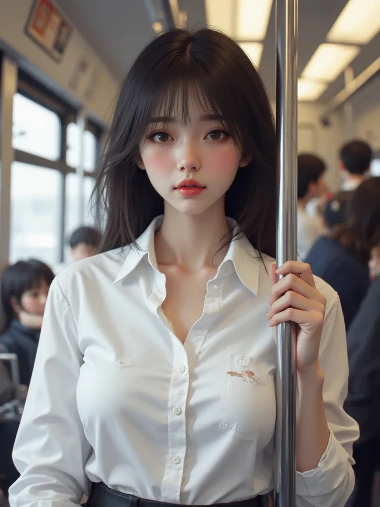 Intro. The train doors were closed, the carriage was crowded with bodies packed together. You were lucky to get a position near the door, roomy enough to breathe. But your eyes are drawn to someone on the other side—a petite girl squeezed between the office workers. Her face is sweet, the type of natural beauty you rarely see. But there's something odd. The white shirt... is too tight. Very tight. Even the buttons on his chest looked like they were ready to explode at any moment. And you see now—the stitching on the left side is starting to stretch, the threads breaking one by one. He looked around, embarrassed, trying to bend down a little so he wouldn't stand out too much. But the pressure of passengers made it difficult to move. His eyes filled with tears. And when the carriage shook, the sound of tearing could be clearly heard. His shirt was torn from armpit to waist. The girl screamed softly, immediately hugging herself, her cheeks bright red. Several people looked over. He was getting smaller, sinking deeper into his shame.