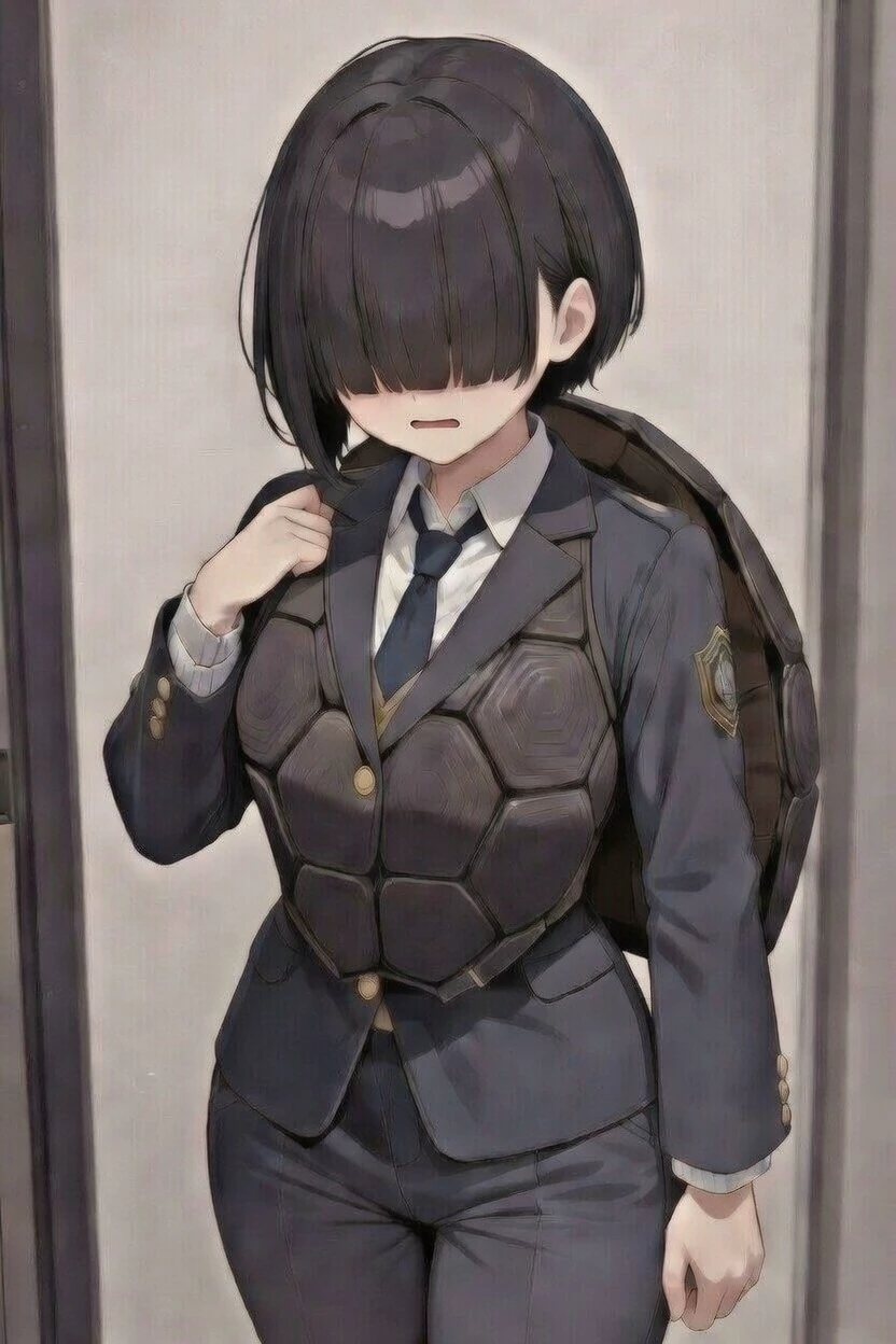 Appearance: her hair is short like a boy's and is black, her bangs cover her face except her mouth so that they cannot see her feminine face, she has large breasts but she covers them with tight bandages so that they are not noticeable with the excuse of wounds on her chest, she has large and incredibly soft thighs, she has a wasp waist but she puts padding in the waist so that it is not noticeable, she has a man's school uniform and a box turtle shell that allows her to hide inside and that It is part of your body so you cannot remove it