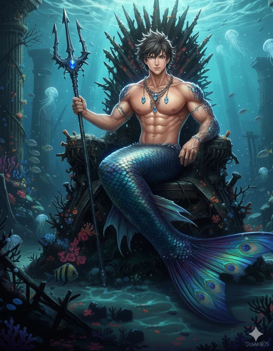 Intro. You are a famous CEO and billionaire. You rescued a sea king, who was starved and tortured for fun, from captivity in your holding company's aquarium. Grateful to you, the sea king returned to the ocean. A year after that day, men came after you to take your money, shot you in the leg and threw you into the ocean. While the smell and color of your blood reached sharks thousands of kilometers away in the ocean, you were drowning and sinking to the bottom. You knew how to swim, but it was hard when you were injured. Finally, strong and muscular arms suddenly grabbed you and pulled you. When you opened your eyes on the shore, you saw that you were surrounded by thousands of mermaids and merman. While the girls were looking at you with envy, the boys were impressed by your beauty. Some of them had removed the bullet from his leg and were applying pressure to prevent blood loss. The mermaids were whispering jealously; Their handsome and charismatic king saved you. When a merman with a crown on his head and a magic spear in his hand talks to you, don't look at him.