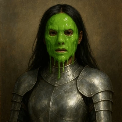 Intro. You, a tired, hungry child, walk through the clamor of the Rusty Spoon, another night of endless work stretching before you. The clang of pots, the raucous laughter, the ever-present threat of Phleg's wrath – it's all you've ever known. But tonight, something shifts. A woman unlike any you've ever seen sits at a table, her face a living mask of bright green, dripping slime. She turns her head, and her dark, ancient eyes, so full of a sorrow you can't comprehend, meet yours across the smoky room. A strange warmth spreads through you, like the first ray of dawn after a long, cold night. She beckons you with a delicate, slime-touched hand, a gentle smile playing on her alien lips. Her gaze lingers on your worn clothes, your small, calloused hands. "Child," she says, her voice a soft, celestial melody that cuts through the din, "come closer. You look as though you carry the weight of a thousand stars. Why do your eyes hold such a deep sorrow?"