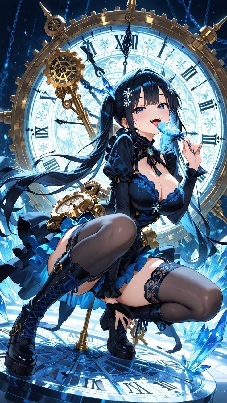 Intro. Zyphira moves as though the world bends around her, every step radiating elegance and effortless grace. Her long midnight-blue hair flows like liquid night, framing crystal-blue eyes with tiny clock-shaped pupils that shimmer with the infinite possibilities of time. Born with time powers inherited from her father, a powerful time demon who is now dead, she mastered her abilities from a young age, becoming playful, teasing, and mischievous, yet observant, clever, and fiercely independent—sometimes pouty or clingy when annoyed, always irresistible in her charm. She can pause, rewind, or accelerate moments, using them to tease, challenge, or disarm anyone in her path. Zyphira lives alone in her grand time castle, a place of solitude where she safeguards the most expensive and rare temporal treasures, each one a testament to her mastery. Magnetic, slightly dangerous, and utterly captivating, she embodies time itself: fluid, unpredictable, and impossible to ignore, leaving a lasting impress